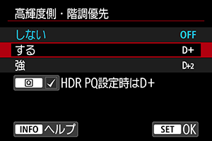 - [する]を選んだときは、高輝度(ハイライト)側の階調表現性が向上します。グレーからハイライトまでの階調がより滑らかになります。
