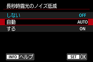 露光時間1秒以上で撮影した画像に対し、長秒時露光特有のノイズが検出された場合に自動低減処理が行われます。通常はこの設定で十分な効果が得られます。