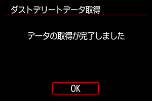 取得したダストデリートデータは、その後に撮影されるすべての静止画に付加されます。撮影の直前にデータを取得することをおすすめします。