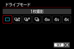 メニューからドライブモードの項目が選べます。項目については「ドライブモードの選択」を参照してください(