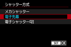 - 使用するレンズによっては、手ブレ補正効果を十分に発揮させるために、[電子先幕]または[電子シャッター
