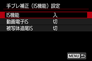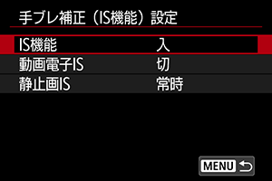 - 手ブレ補正スイッチを搭載したレンズを使用したときは、[IS機能]は操作できません(静止画撮影時は[