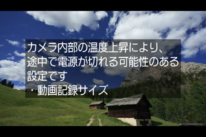このガイダンスは、現在の設定で動画を撮影すると、撮影中にカメラ内部の温度が上昇し、さらに撮影を続けると自動的にカメラの電源が切れる可能性があることを示しています。