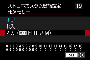 M (FEM時有効)]を割り当てたボタンを押すことで、ストロボの発光モード[ETTL]で撮影した発光量を、発光モード[M]の発光量として設定できます。ここでは