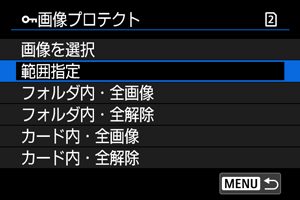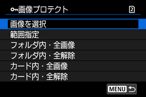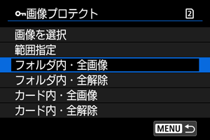 :画像プロテクト]で[フォルダ内・全画像]または[カード内・全画像]を選ぶと、その中のすべての画像がプロテクトされます。