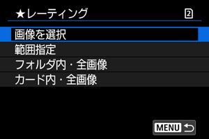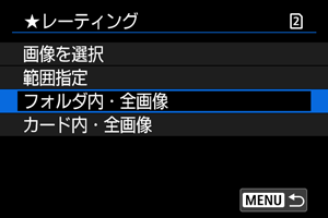 :レーティング]で[フォルダ内・全画像]または[カード内・全画像]を選ぶと、その中のすべての画像がレーティングされます。