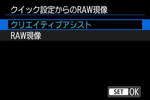クイック設定画面から行うRAW現像の種類を選ぶことができます。