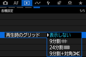 静止画を1枚表示するときに、再生画像に重ねてグリッド(格子線)を表示することができます。撮影画像の水平/垂直の傾きや、構図を確認するときに便利です。