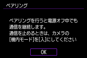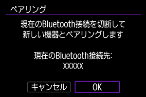 - スマートフォン側に、前回ペアリングしたときのカメラの登録が残っていると、ペアリングすることができません。スマートフォンのBluetooth設定画面で、前回ペアリングしたカメラの登録を解除してから、ペアリングをやり直してください。