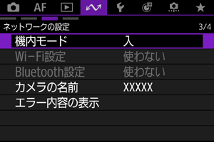 電源オフ中にカメラとのWi-Fi/Bluetooth接続を行いたくないときは、[:機内モード]を[入]に設定するか、[