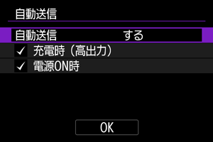 - [充電時(高出力)]は、カメラの電源がオフの状態で、USB接続をして充電を行うとき、自動送信を開始します。なお、バッテリーの残量が少なければ、しばらく充電した後、自動送信を開始します。