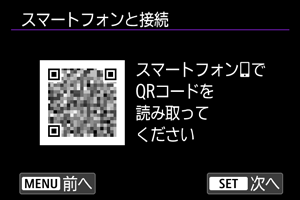 - Camera Connectのインストールが済んでいないときは、画面のQRコードをスマートフォンで読み取り、Google PlayまたはApp StoreにアクセスしてCamera Connectをインストールしてから、