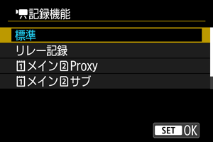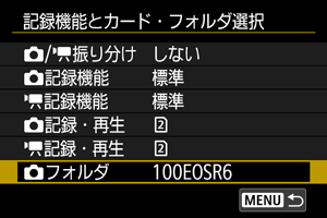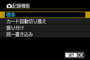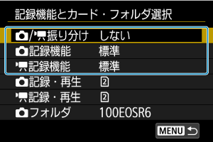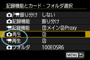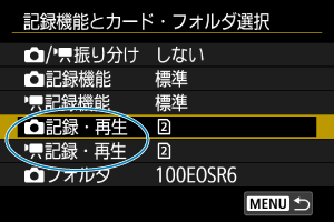 記録機能]を[標準][リレー記録]に設定したときは、画像を「記録・再生」するカードを選択します。