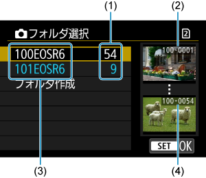 - 1つのフォルダには、画像が最大9999枚保存されます(画像番号0001~9999)。フォルダ内の画像がいっぱいになると、番号が1つ繰り上がったフォルダが自動的に作成されます。また、強制リセット()を行ったときもフォルダが自動的に作成されます。フォルダは100~999まで作成することができます。