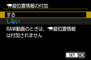 :動画記録形式]を[RAW]に設定したときは、動画縦位置情報は付加されません。