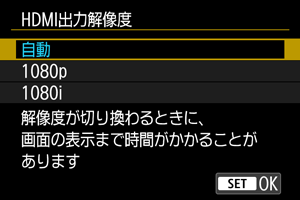 カメラとテレビや外部記録機器などを、HDMIケーブルで接続して映像を出力するときに、解像度を設定することができます。