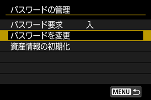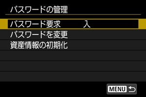 カメラの電源スイッチをにしたときや、オートパワーオフから復帰したときに入力するパスワードを管理します。カメラ起動時のパスワード設定方法については、パスワードを設定するを参照してください。