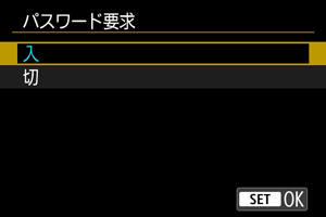 カメラの電源スイッチをにしたときや、オートパワーオフから復帰したときに、パスワードを要求するかどうかを設定できます。