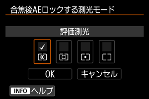 ワンショットAFでピントが合ったときに、露出を固定(AEロック)するかどうかを、測光モードごとに設定することができます。シャッターボタンを半押ししている間、露出が固定されます。AEロックする測光モードを選び、[]を付けます。[OK]を選ぶと設定されます。