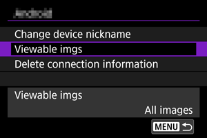 - [Viewable imgs/Көрсетілетін суреттер] параметрі [All images/Барлық суреттер] параметрінен басқа кез келген параметрге орнатылса, қашықтан түсіру мүмкін болмайды.