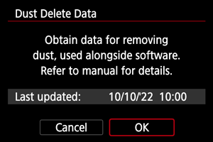 Камера алынған Шаңды жою деректерін бұдан әрі барлық түсірілімдерге қосады. Түсірместен бұрын Шаңды жою деректерін дереу алу ұсынылады.