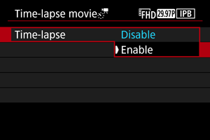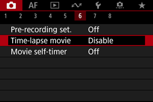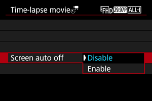 - Келесі операциялар уақыт үзілісі бар фильм жазу үшін күтуді болдырмайды және параметрді [Disable/Өшіру] мәніне орнатады.