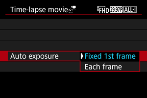 - Түсірілімдер арасындағы ашықтықтағы айтарлықтай өзгертулер [Interval/Аралық] параметрі 3 секундқа немесе одан аз уақытқа орнатылғанда және [Auto exposure/Автоэкспозиция] параметрі [Each frame/Әрбір кадр] параметріне орнатылған кезде камераның көрсетілген аралықта түсіруіне кедергі келтіруі мүмкін.