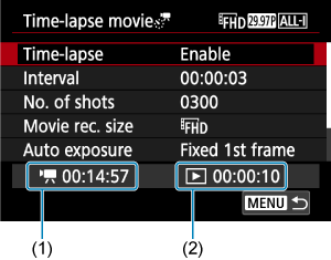 Орнатылған аралықтармен түсірілген фотосуреттерден 4K фильмінде немесе Full HD фильмінде уақыт үзілісі бар фильм жасау кезінде фильм жазу уақытын (фильмді ойнату үшін қажет уақыт) көрсетеді.