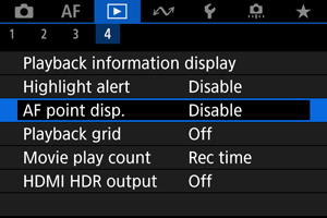 1. [Ойнату: AF point disp./Ойнату: AF нүктесі дисплейі] параметрін таңдаңыз.