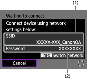 - Камера экранында көрсетілген SSID идентификаторын (1) және Password (Құпия сөзді) (2) тексеріңіз.