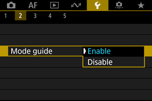 Түсіру режимінің қысқаша сипаттамасын түсіру режимдерін ауыстырған кезіңізде көрсетуге болады. Әдепкі параметр — [Enable/Қосу].