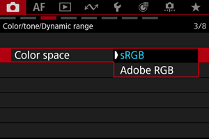 This color space is mainly used for commercial printing and other professional applications. Recommended when using equipment such as Adobe RGB-compatible monitors or DCF 2.0 (Exif 2.21 or later) compatible printers.