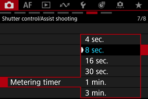 You can set how long the metering timer runs (which determines the duration of exposure value display) after it is triggered automatically by an action such as pressing the shutter button halfway.