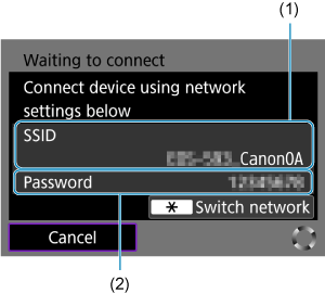 - Check the SSID (1) and Password (2) displayed on the camera screen.