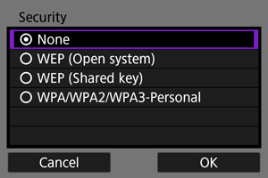 - The same type of security must be set on both the other device and the camera. See Authentication and data encryption methods for details on types of authentication and encryption.