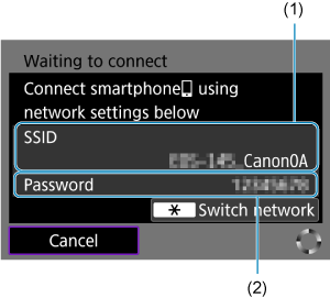 - In other device's Wi-Fi settings, select the SSID (network name) shown on the camera screen, then enter the password.