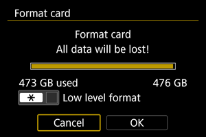 - During low-level formatting, you can cancel formatting by selecting [Cancel]. Even in this case, normal formatting will already be complete and you can use the card as usual.