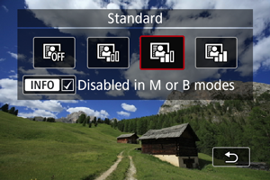 - Егер [Disable/Өшіру] күйінен басқа параметр орнатылса және экспозицияны күңгірттеу үшін экспозиция компенсациясы не жарқыл экспозициясының компенсациясын пайдаланатын болсаңыз, сурет әлі де ашық болып шығуы мүмкін. Егер экспозицияны күңгірттеу жасауды қаласаңыз, бұл функцияны [Disable/Өшіру] күйіне орнатыңыз.