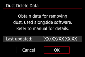 Шаң дақтарын өшіру үшін пайдаланылған Шаңды жою деректері суреттерге қосылуы мүмкін. Шаң дақтарын автоматты түрде кетіру үшін Шаңды жою деректері Digital Photo Professional (EOS бағдарламалық жасақтамасы) бірге пайдаланылады.