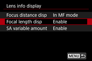 [Lens info display/Объектив ақпаратының дисплейі] параметрін таңдаңыз.