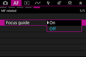 : Фокустау бағыттағышы] параметрін [On/Қосу] мәніне орнату фокус реттелетін бағытты және қажетті реттеу ауқымын көрсететін бағыттағыш жақтауды береді.