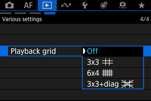 Панорамалық кескіндер көрсетілгенде, [Playback grid/Ойнату торы] параметрі [Off/Өшірулі] параметрінен басқа опцияға орнатылған болса, бір тік және көлденең сызық көрсетіледі.