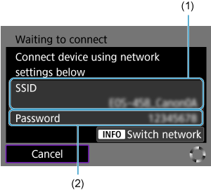 - Камера экранында көрсетілген SSID идентификаторын (1) және құпиясөзді (2) тексеріңіз.