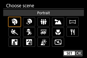 : Түсіру режимі] мәзіріндегі [Choose scene/Көріністі таңдау] экранына кіргеннен кейін түсіру режимін таңдаңыз.