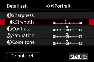 - 3-қадамда [Default set./Әдепкі параметр] тармағын таңдау арқылы тиісті Picture Style параметрлерін олардың әдепкі мәндеріне қалпына келтіре аласыз.