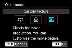 Picture Style, Color Filter (Түс сүзгісі) немесе Custom Picture (Өзгертпелі сурет) мәзірінен қалаған фильм немесе фотосурет сипаттамаларын орнатуыңызға болады.