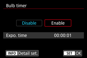 Шам экспозициялары үшін экспозиция уақытын алдын ала орната аласыз. Бұл мүмкіндік шам экспозициялары кезінде ысырма түймесін басып тұру қажеттілігін жояды, ол камераның шайқалуын азайта алады.
