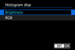 Гистограммалар тоналды ауқымдағы сигнал деңгейлерін көрсетеді. Ашықтық дисплейі (жалпы экспозиция деңгейі мен жалпы градацияны тексеру үшін) және RGB дисплейі (қызыл, жасыл және көк түстердің қанықтығы мен градациясын тексеру үшін) қолжетімді. Көрсетілген гистограмманы [] белгішесі [