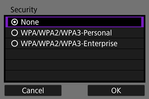 - Қауіпсіздіктің бірдей түрі басқа құрылғы мен камераның екеуінде де орнатылуы тиіс. Түпнұсқалықты растау және шифрлау түрлері туралы мәліметтерді Түпнұсқалықты растау және деректерді шифрлау әдістері бөлімінен қараңыз.