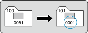 Файлды нөмірлеуді қолмен ысырған кезде жаңа қалта автоматты түрде жасалады және бұл қалтаға сақталған суреттердің файл нөмірлеуі 0001 нөмірінен басталады.